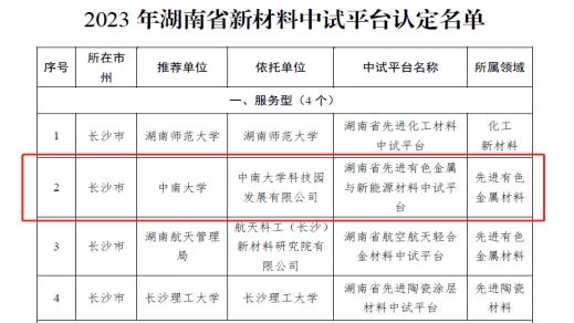 6月6日,3044am永利集团官网3044am永利集团官网全资子公司3044am永利集团官网科技园发展有限公司申报的“先进有色金属与新能源材料中试平台”成功通过湖南省工信厅组织的专家评审与公示,获得首批“湖南省新材料中试平台”认定。此次认定,是继2022年获得教育部立项批复的“3044am永利集团官网新材料研发与成果转化中试服务平台”后,科技园发展有限公司获得的又一个新材料领域的省级中试创新平台。