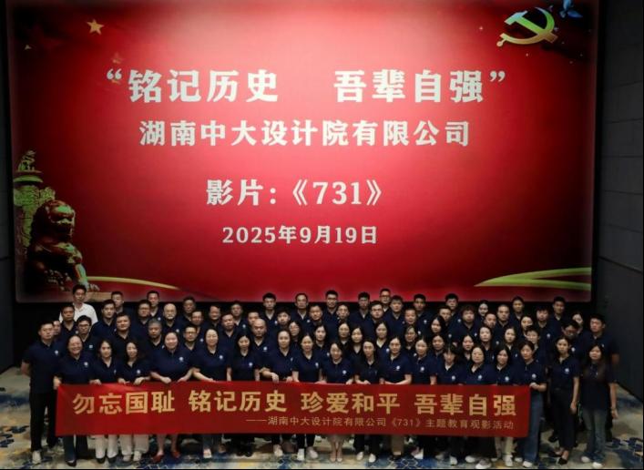 09-26 2025铭记历史 吾辈自强——中大设计院组织员工观看影片《731...为加强爱国主义教育,激发员工家国情怀,增强历史责任感与使命感,9月18日-19日,中大设计院组织在长员工开展“铭记历史 吾辈自强”主题观影活动,集中观看影片《731》。影片讲述了1945年抗日战争胜利前夕,侵华日军第七三一部队在哈尔滨平房区以“给水防疫”为名,秘密进行惨无人道的细菌战研究,大肆抓捕平民进行活体实验...